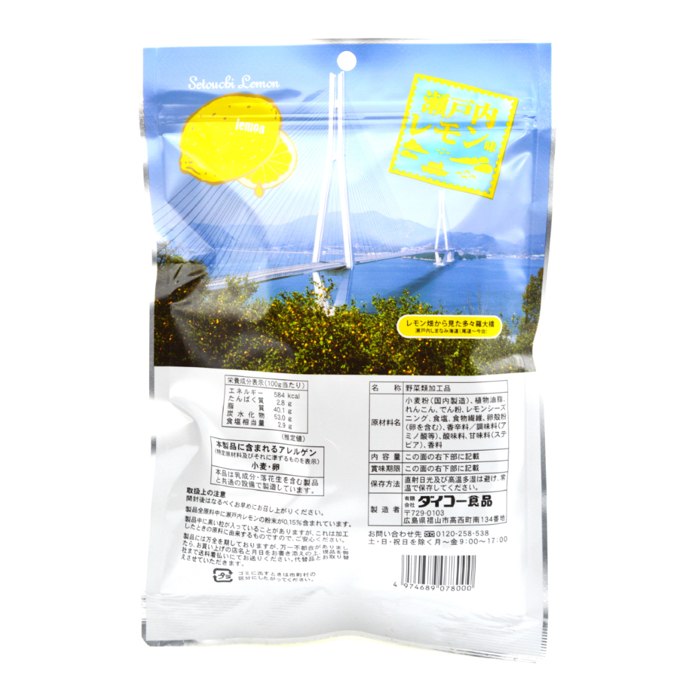 한쪽 면에만 튀김옷을 입혀 바삭하게 튀긴 연근을, 산뜻하고 상쾌한 세토우치산 레몬 맛으로 완성. 간편하게 식이섬유를 섭취할 수 있는 칩스로, 간식이나 안주로도 좋습니다.